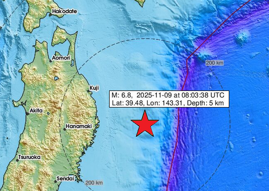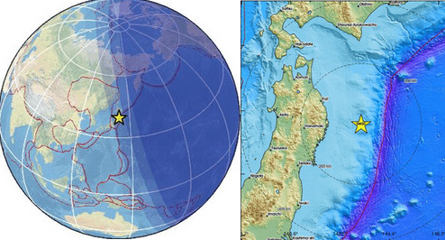 Two strong earthquakes struck Off The East Coast Of Honshu, Japan today. The first Magnitude 6.8 at 8:03 UTC followed up by a Magnitude 6.4 Earthquake just 50 minutes later.