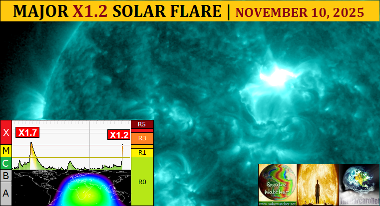 A long duration X-Flare X1.2 was unleashed around Active Region 14274 at 9:18 UTC. A type II radio emission with an estimated velocity of 1321 km/s was registered. Associated with this event was a full halo coronal mass ejection (CME) now visible via solar telemetry and heading directly to Earth and will be geoeffective in 2 days (Nov 12) where a possible G3 or 4 Geomagnetic storm is expected. Aurora sky watchers should have two good days for viewing November 12th with two X-Class solar flares released while in a perfect earth-facing position on the solar corona.