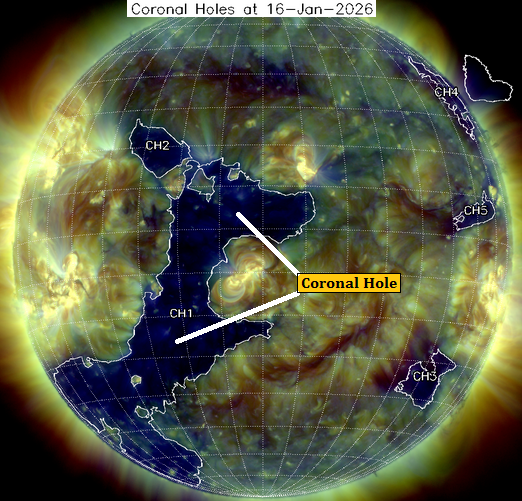 - Prediction: There are several nodes of this large coronal hole that will provide high-speed solar wind stream reaching Earth as high speed and the potential for increased geomagnetic activity. January 19 and 20 will be the key dates for a significant geophysical event.